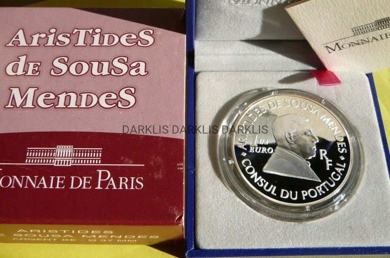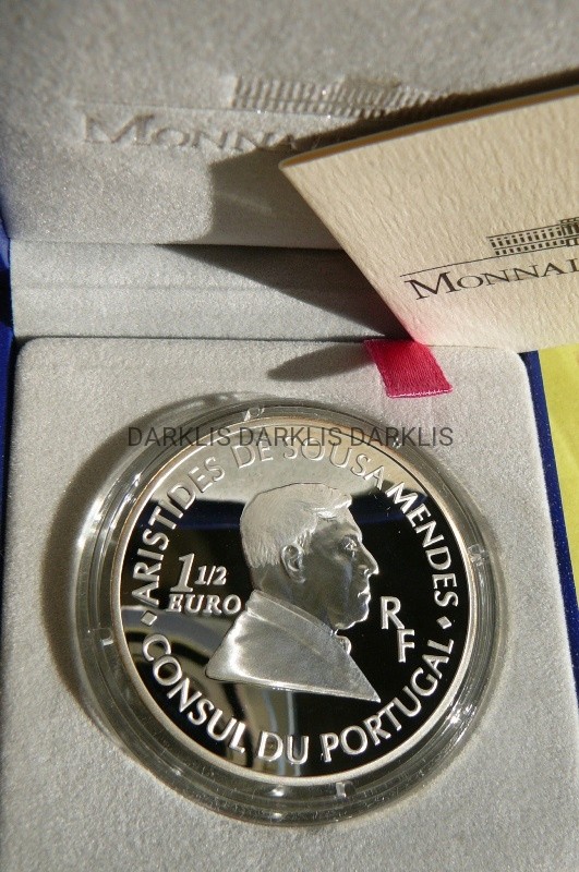 NA AUKCJI WYSTAWIANA JEST PRZEPIĘKNA ORYGINALNA SREBRNA MONETA KOLEKCJONERSKA - 1,5 EURO - FRANCJA 2007 - KONSUL PORTUGALII ARISTIDES DE SOUSA MENDES - SREBRO 900 - PROOF - MENNICZA + CERTYFIKAT AUTENTYCZNOŚCI + ETUI + KARTON - NAKŁAD TYLKO 3TYS. SZTUK - WARTOŚĆ KATALOGOWA 220 EURO - WYDANO PRZEZ FRANCUSKĄ MENNICĘ NARODOWĄ W PARYŻU - NA INNYCH AUKCJACH WYSTAWIAM DUŻO MONET EURO O RÓŻNYM NOMINALE - ZAPRASZAM DO OBEJRZENIA