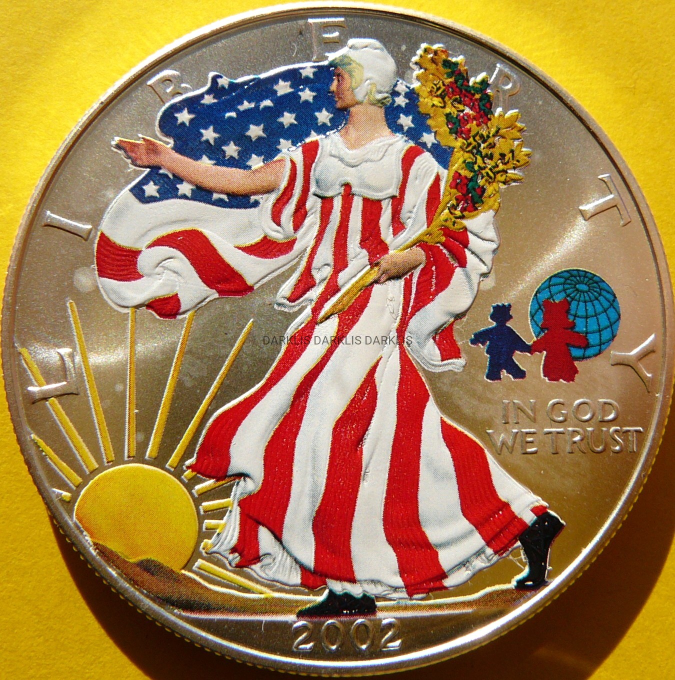 NA AUKCJI WYSTAWIANA JEST PRZEPIĘKNA ORYGINALNA SREBRNA MONETA KOLEKCJONERSKA - DOLLAR - USA 2002 - EAGLE - LIBERTY / BOGINI WOLNOŚCI - LIMITOWANA EDYCJA : ŚWIATOWY DZIEŃ DZIECKA - KOLOR - CZYSTE SREBRO PRÓBY 999 - UNCJA - MATT - RARYTAS - BARDZO RZADKA - NA INNYCH AUKCJACH WYSTAWIAM MONETY Z TEJ SERII - ZAPRASZAM DO OBEJRZENIA