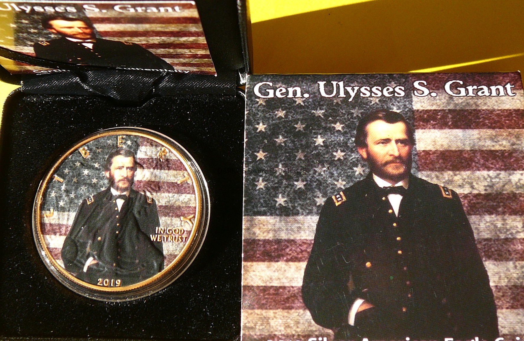 NA AUKCJI WYSTAWIANA JEST PRZEPIĘKNA ORYGINALNA SREBRNA MONETA KOLEKCJONERSKA PLATEROWANA 24 KARATOWYM ZŁOTEM - DOLLAR - USA 2019 - GEN. ULYSSES S. GRANT - seria : SŁYNNI AMERYKANIE - CZYSTE SREBRO PRÓBY 999 - UNCJA - KOLOR - STEMPEL MATT - RARYTAS - BARDZO RZADKA - NAKŁAD TYLKO 250 SZTUK !! + CERTYFIKAT AUTENTYCZNOŚCI + ETUI + KARTON - NA INNYCH AUKCJACH WYSTAWIAM MONETY Z TEJ SERII - ZAPRASZAM DO OGLĄDANIA