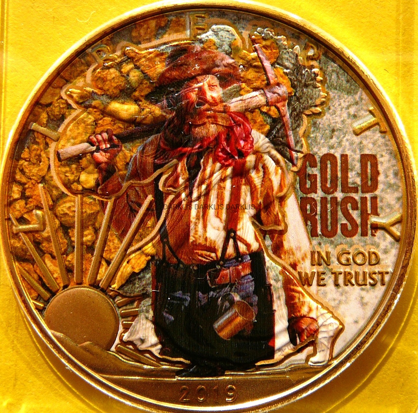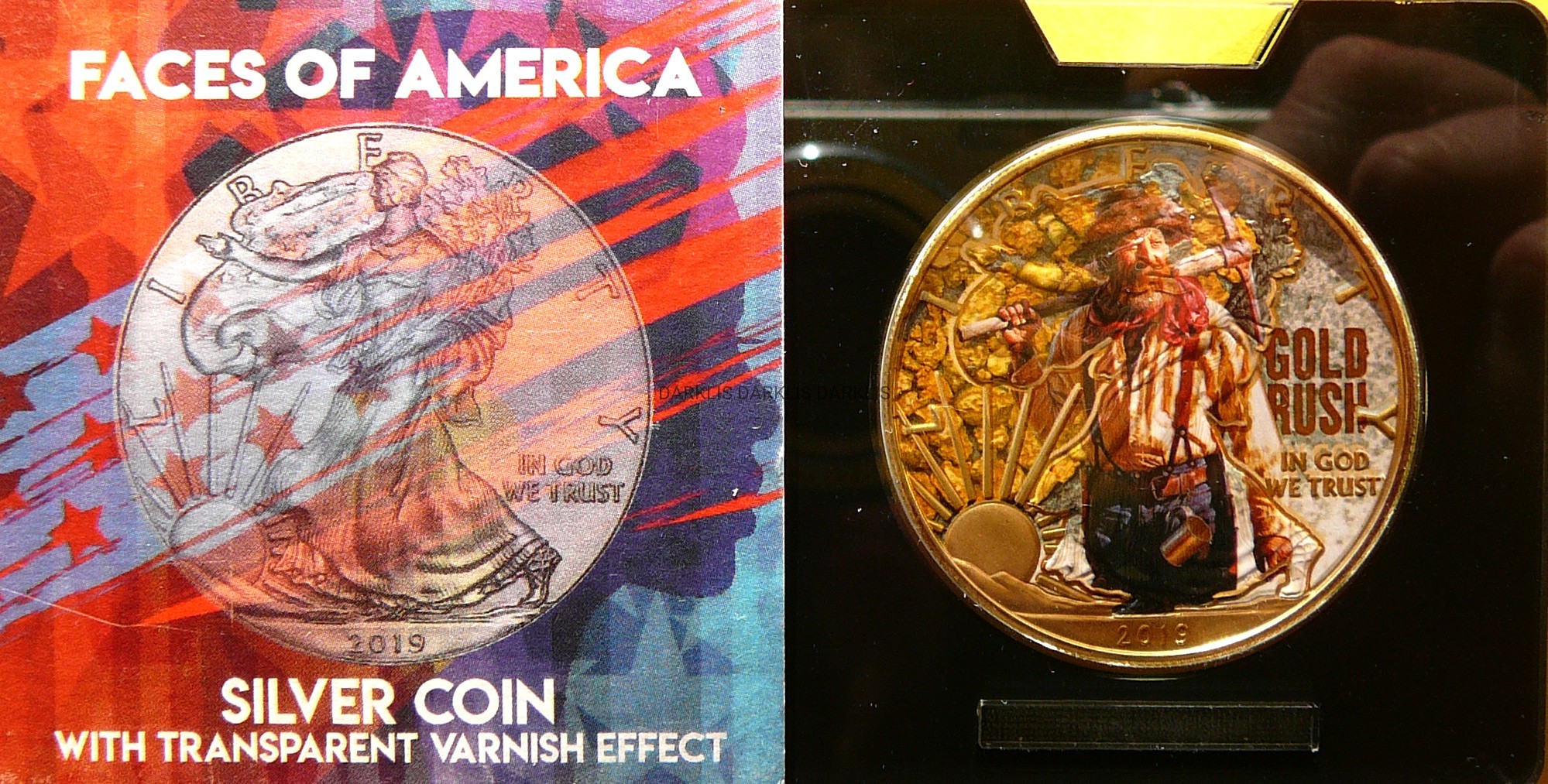 NA AUKCJI WYSTAWIANA JEST PRZEPIĘKNA ORYGINALNA SREBRNA MONETA KOLEKCJONERSKA PLATEROWANA 24 KARATOWYM ZŁOTEM - DOLLAR - USA 2019 - GORĄCZKA ZŁOTA - seria : TWARZE AMERYKI - CZYSTE SREBRO PRÓBY 999 - UNCJA - KOLOR - STEMPEL MATT - RARYTAS - BARDZO RZADKA - NAKŁAD TYLKO 100 SZTUK !! + CERTYFIKAT AUTENTYCZNOŚCI + ETUI + KARTON - NA INNYCH AUKCJACH WYSTAWIAM MONETY Z TEJ SERII - ZAPRASZAM DO OGLĄDANIA