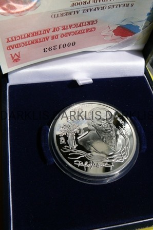 NA AUKCJI WYSTAWIONA JEST PRZEPIĘKNA ORYGINALNA SREBRNA MONETA KOLEKCJONERSKA - 10 EURO - HISZPANIA 2002 - RAFAEL ALBERTI - 100 ROCZNICA URODZIN - SREBRO 925 - PROOF - MENNICZA - RZADKA + CERTYFIKAT AUTENTYCZNOŚCI + ETUI - WYDANA PRZEZ HISZPAŃSKĄ MENNICĘ KRÓLEWSKĄ - MONETA w ORYGINALNYM MENNICZYM OPAKOWANIU - WARTOŚĆ KATALOGOWA 65 EURO - NA INNYCH AUKCJACH MONETY Z TEJ SERII