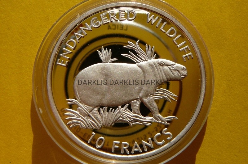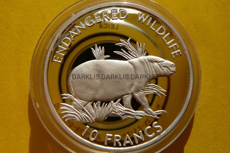 NA AUKCJI WYSTAWIANA JEST PRZEPIĘKNA SREBRNA MONETA - 10 FRANC - KONGO 1999 - HIPOPOTAM KARŁOWATY / PYGMY HIPOPOTAM - ZAGROŻONE GATUNKI / OCHRONA ŻYCIA DZIKICH ZWIERZĄT - RZADKA - RARYTAS - PROOF - SREBRO 925 - NA INNYCH AUKCJACH MONETY Z TEJ SERII - ZAPRASZAM DO OGLĄDANIA