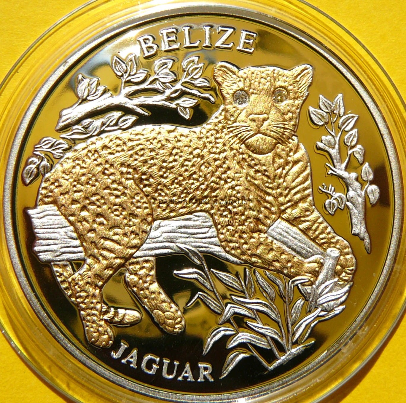 NA AUKCJI WYSTAWIANA JEST PRZEPIĘKNA JEDNA ORYGINALNA i RZADKA SREBRNA MONETA KOLEKCJONERSKA PLATEROWANA CZYSTYM ZŁOTEM 24 KARAT z DWOMA BRYLANTAMI - 10 DOLLARS - LIBERIA 2005 - PUMA JAGUAR z BELIZE - ZAGROŻONE GATUNKI / OCHRONA ŻYCIA DZIKICH ZWIERZĄT - CZYSTE SREBRO PRÓBY 999 PLATEROWANE ZŁOTEM 24 KARAT + DWA BRYLANTY W OCZACH - PROOF - BARDZO RZADKA i DROGA RARYTAS - POLECAM - NA INNYCH AUKCJACH WYSTAWIAM MONET z TEJ SERII - ZAPRASZAM DO OGLĄDANIA
