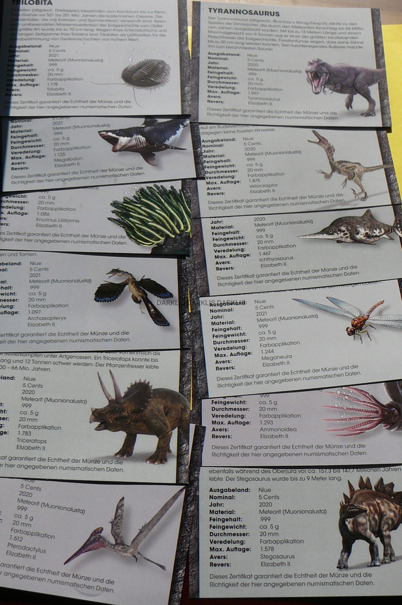 NA AUKCJI WYSTAWIONY JEST PRZEPIĘKNY ORYGINALNY i BARDZO RZADKI ZESTAW MONET KOLEKCJONERSKICH - 12 x 5 CENTÓW - NIUE 2020 - WELOCIRAPTOR / TYRANOZAUR / TRICERATOPS / STEGOZAUR / PTERODAKTYL / ICHTIOZAUR - NIUE 2021 - MEGALODON / ENCRINUS LILIIFORMIS / TRYLOBIT / MEGANEURA / AMONIT / ARCHEOPTERYKS - seria : METORYT STOP MUONIONALUSTA - CAŁY KOMPLETNY ZESTAW - CZYSTY METEORYT PRÓBY 999 - STEMPEL MATT - KOLOR - POLECAM - RARYTAS - BARDZO RZADKA - NAKŁAD 1.086 do 1.997 SZTUK!! + CERTYFIKAT AUTENTYCZNOŚCI + ORYGINALNE ETUI - NA INNYCH AUKCJACH MONETY Z TEJ SERII - ZAPRASZAM DO OGLĄDANIA
