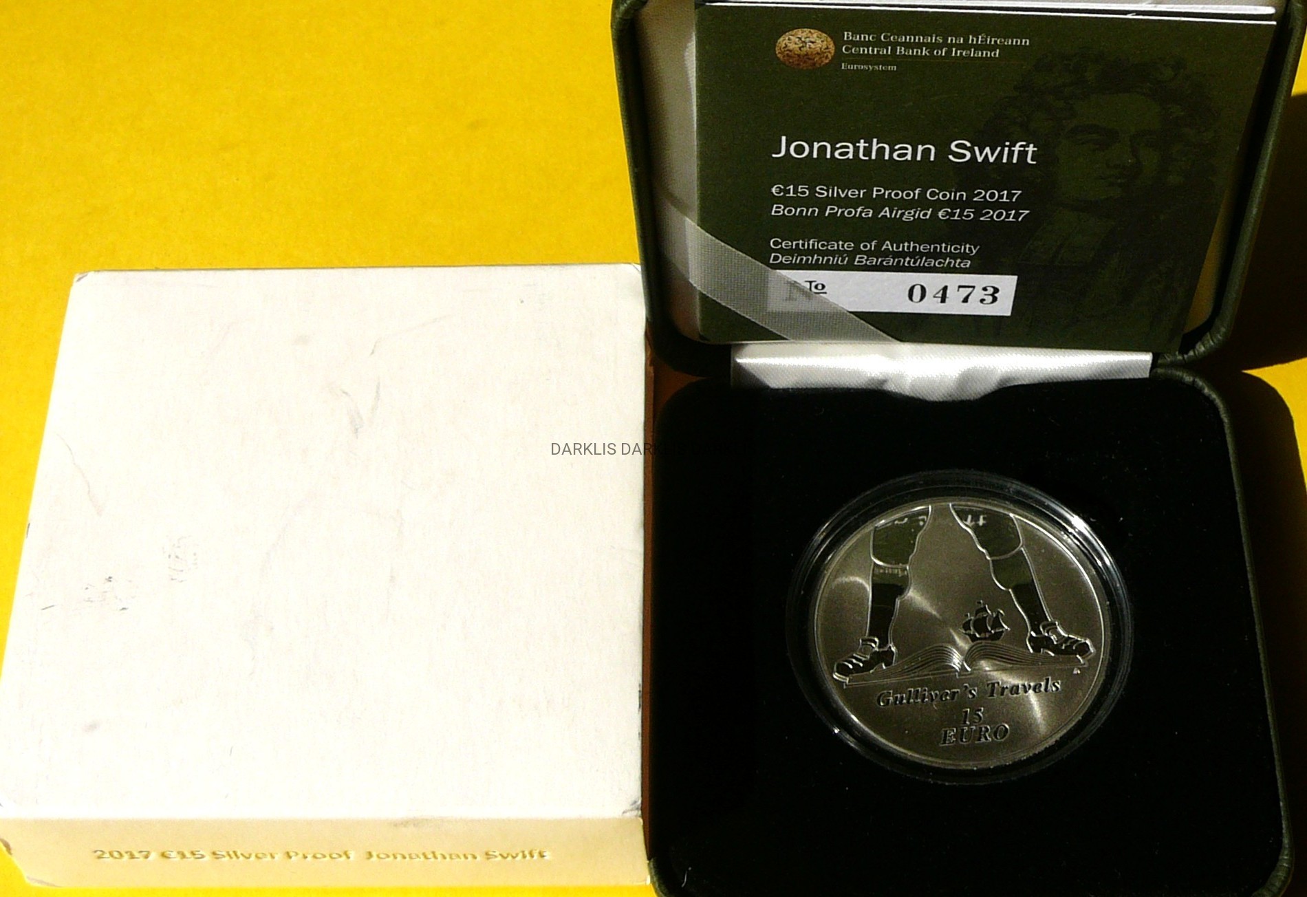 NA AUKCJI WYSTAWIONA JEST PRZEPIĘKNA ORYGINALNA SREBRNA MONETA KOLEKCJONERSKA - 15 EURO - IRLANDIA 2017 - JONATHAN SWIFT PODRÓŻE GULIWERA - SREBRO PRÓBY 925 - RARYTAS - BARDZO RZADKA - NAKŁAD TYLKO 2.000 SZTUK !! + CERTYFIKAT AUTENTYCZNOŚCI + ETUI + KARTON - NA INNYCH AUKCJACH WYSTAWIAM MONETY Z TEJ SERII - ZAPRASZAM DO OGLĄDANIA