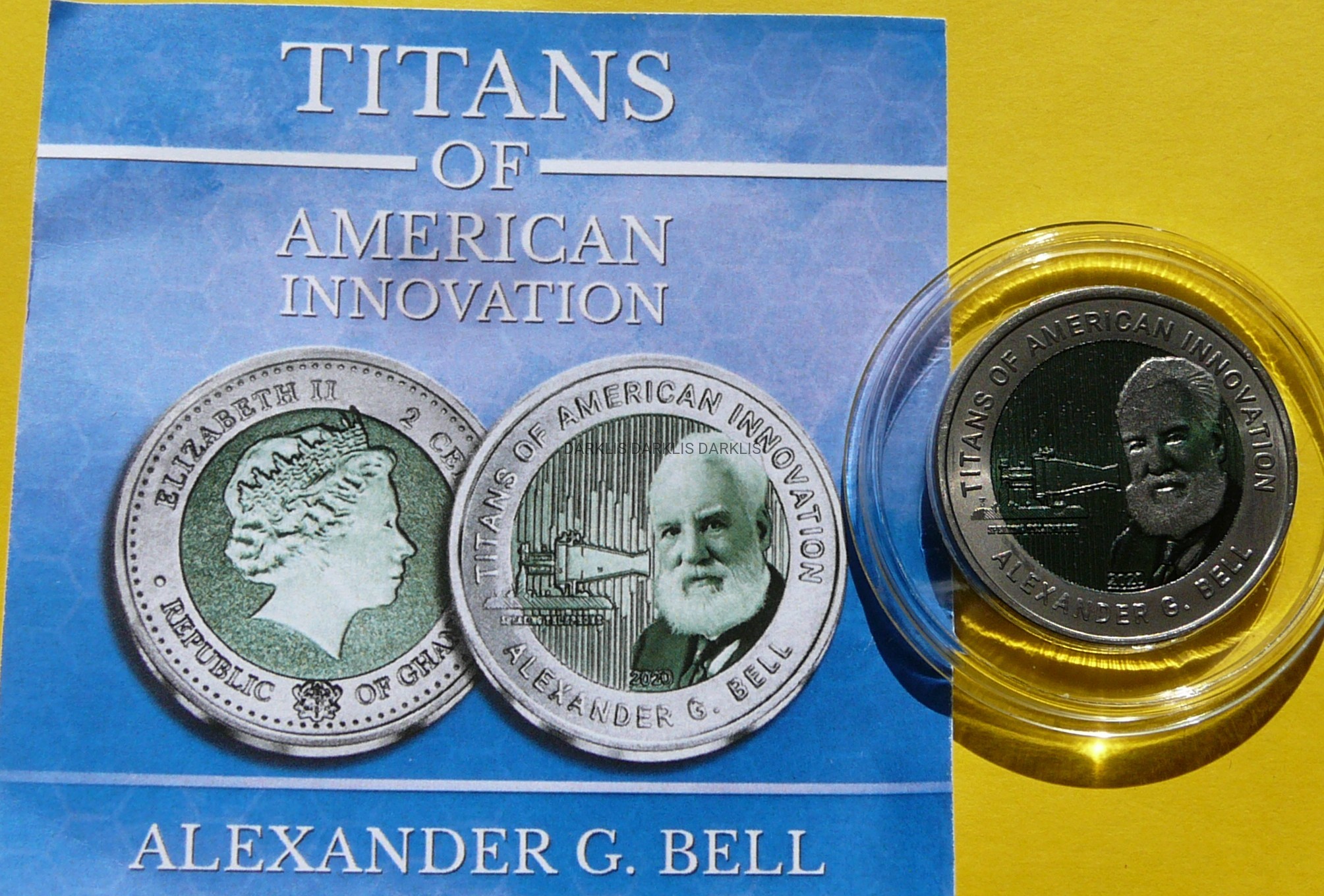 NA AUKCJI WYSTAWIANA JEST PRZEPIĘKNA ORYGINALNA i RZADKA MONETA KOLEKCJONERSKA - 2 CEDIS - GHANA 2020 - ALEKSANDER GRAHAM BELL - TYTANI AMERYKAŃSKIEJ INNOWACJI - MENNICZA - METAL TYTAN - RARYTAS - BARDZO RZADKA - NAKŁAD 5.000 SZTUK !!! + CERTYFIKAT AUTENTYCZNOŚCI - NA INNYCH AUKCJACH WYSTAWIAM MONETY Z TEJ SERII - ZAPRASZAM DO OGLĄDANIA