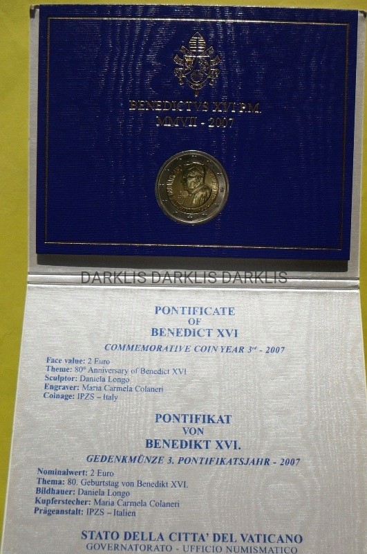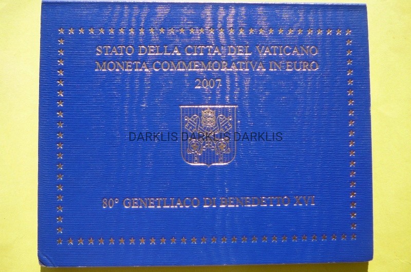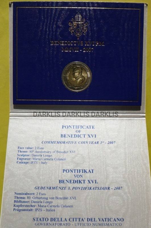 NA AUKCJI WYSTAWIANA JEST PRZEPIĘKNA ORYGINALNA i RZADKA MONETA OKOLICZNOŚCIOWA - 2 EURO - WATYKAN 2007 - PAPIEŻ BENEDYKT XVI 80 URODZINY - MENNICZA - BARDZO RZADKA NAKŁAD 100 TYS. SZTUK / WARTOŚĆ KATALOGOWA 200 EURO - NA INNYCH AUKCJACH WYSTAWIAM DUŻO MONET EURO z WATYKANU, MONACO, SAN MARINO, ANDORRY i INNE