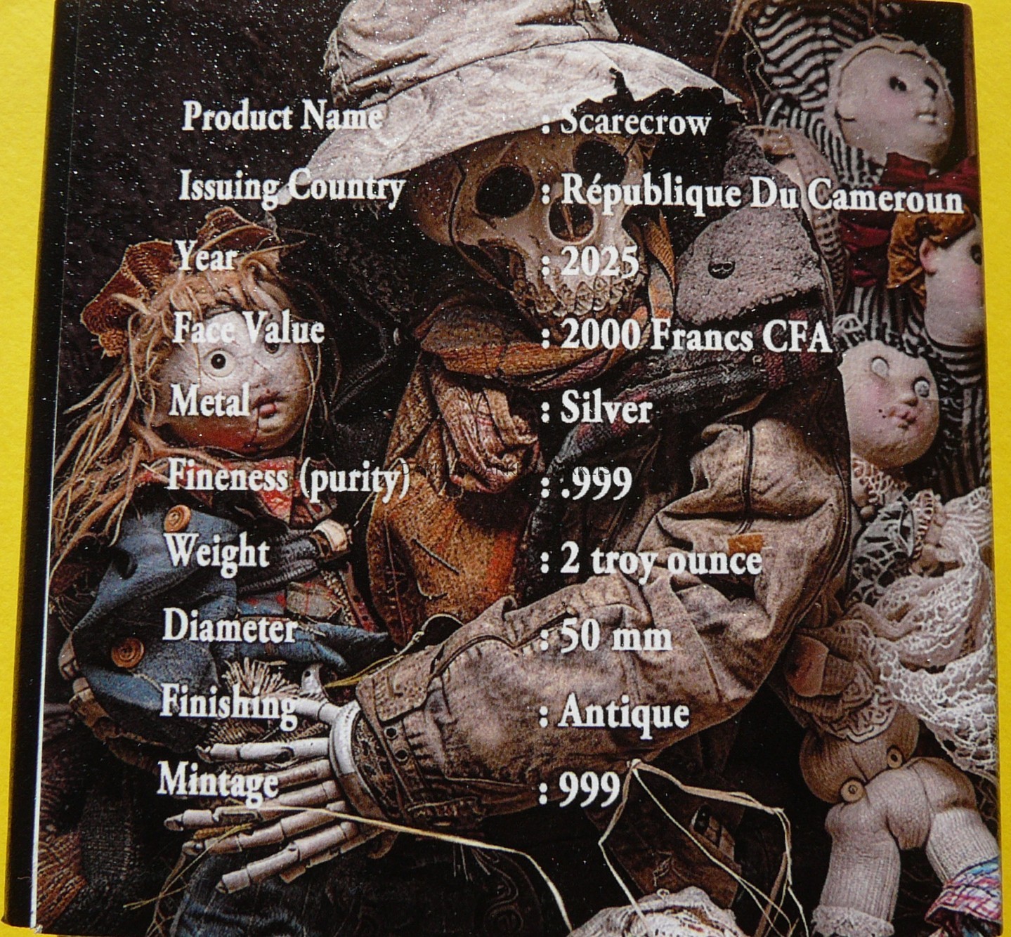 NA AUKCJI WYSTAWIANA JEST PRZEPIĘKNA ORYGINALNA SREBRNA I BARDZO RZADKA MONETA KOLEKCJONERSKA - 2000 FRANKÓW - KAMERUN 2025 - STRACH NA WRÓBLE / SCARECROW - CZYSTE SREBRO PRÓBY 999 - 2 UNCJE - STEMPEL ANTIQUE FINISH - ULTRA HIGH RELIEF - KOLOR EFEKT ŚWIECENIA W NOCY - MENNICZA - RARYTAS - BARDZO RZADKA - NAKŁAD TYLKO 999 SZTUK + CERTYFIKAT AUTENTYCZNOŚCI + ETUI + KARTON - NA INNYCH AUKCJACH WYSTAWIAM MONETY Z TEJ SERII - ZAPRASZAM DO OGLĄDANIA