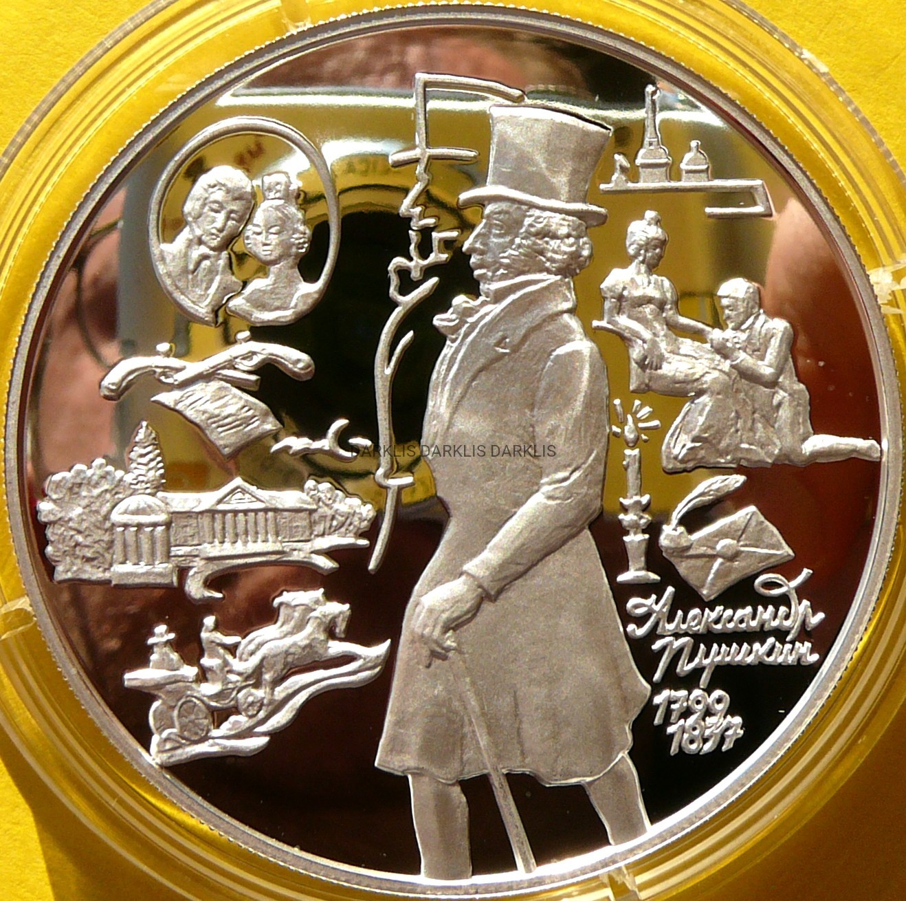 NA AUKCJI WYSTAWIONA JEST PRZEPIĘKNA ORYGINALNA i RZADKA MONETA KOLEKCJONERSKA - 25 RUBLI - ROSJA 1999 - 200 ROCZNICA URODZIN A.S PUSZKIN - SREBRO PRÓBY 900 - 5 UNCJI CZYSTEGO SREBRA 999 - MENNICZA - STEMPEL LUSTRZANY - RARYTAS - BARDZO RZADKA - NAKŁAD TYLKO 3.000 SZTUK!! - NA INNYCH AUKCJACH WYSTAWIAM MONETY Z TEJ SERII - ZAPRASZAM DO OGLĄDANIA