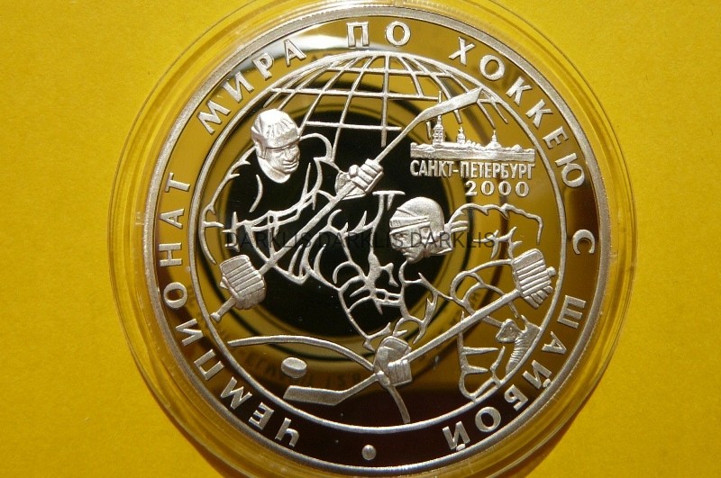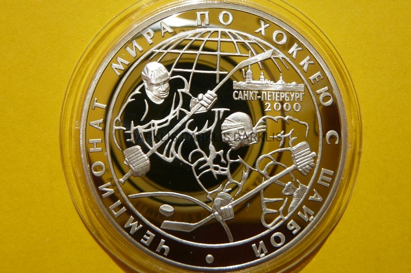 NA AUKCJI WYSTAWIONA JEST PRZEPIĘKNA SREBRNA MONETA - 3 RUBLE - ROSJA 2000 - MISTRZOSTWA ŚWIATA W HOKEJU NA LODZIE - PETERSBURG 2000 - SREBRO 900 - 34,9g - RARYTAS - RZADKA - NAKŁAD 3 TYS SZTUK - WARTOŚĆ KATALOGOWA 600 EURO POLECAM - NA INNYCH AUKCJACH WYSTAWIAM DUŻO SREBRNYCH MONET Z ROSJI i BYŁYCH REPUBLIK RADZIECKICH - ZAPRASZAM DO OBEJRZENIA