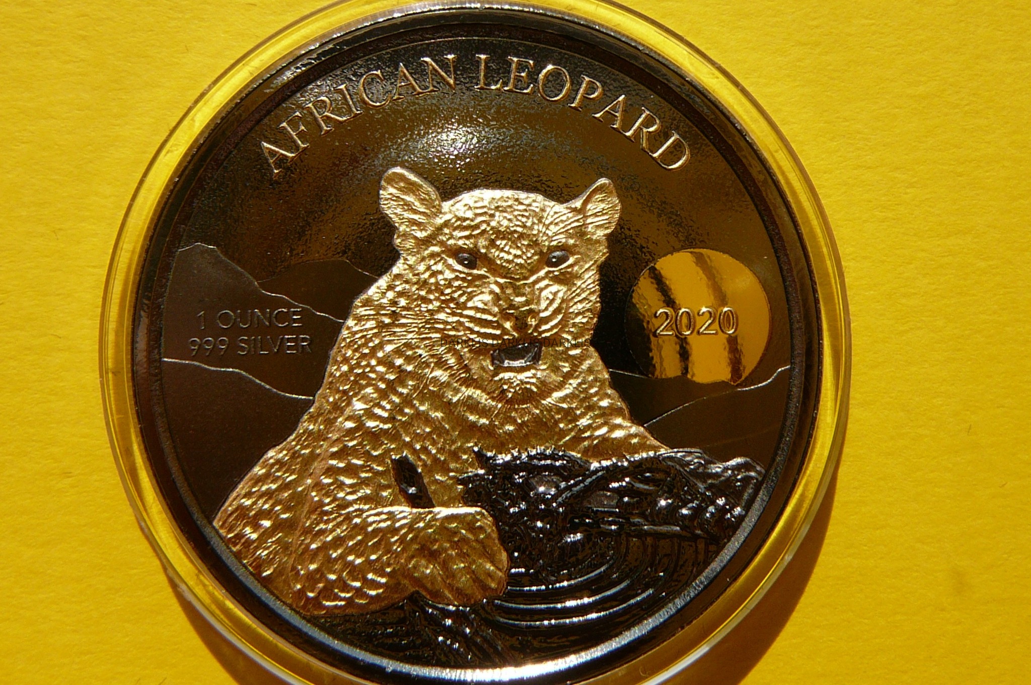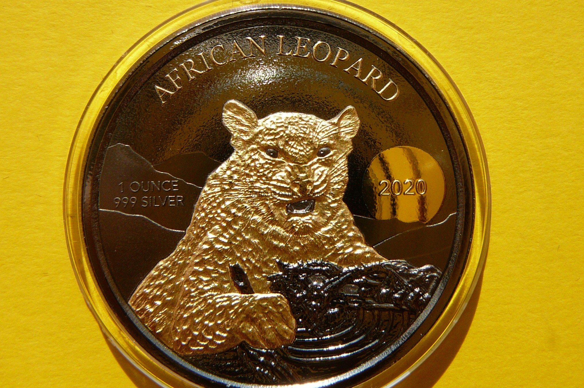NA AUKCJI WYSTAWIANA JEST PRZEPIĘKNA SREBRNA MONETA KOLEKCJONERSKA PLATEROWANA 24 KARATOWYM ZŁOTEM i RUTHENEM - RARYTAS - 5 CEDIS - GHANA 2020 - LEOPARD AFRYKAŃSKI / LEOPARD AFRICAN - LIMITOWANA EDYCJA TYLKO 500 SZTUK - BLACK ENIGMA - SREBRO/ZŁOTO 999 - BLACK RUTHENIUM - UNCJA - MENNICZA - RZADKA - RARYTAS + CERTYFIKAT AUTENTYCZNOŚCI ... + ETUI - NA INNYCH AUKCJACH MONETY Z TEJ SERII
