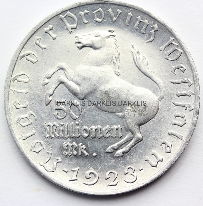 NA AUKCJI WYSTAWIANA JEST PRZEPIĘKNA STARA ORYGINALNA NIEMIECKA MONETA - 50 MILIONÓW MAREK - NIEMCY WESTFALIA 1923 - STEIN / KOŃ - ORYGINAŁ - NA INNYCH AUKCJACH WYSTAWIAM DUŻO STARYCH NIEMIECKICH MONET TALARÓW i MAREK - ZAPRASZAM DO OBEJRZENIA - KOMIS STEIN 11/11/01/24