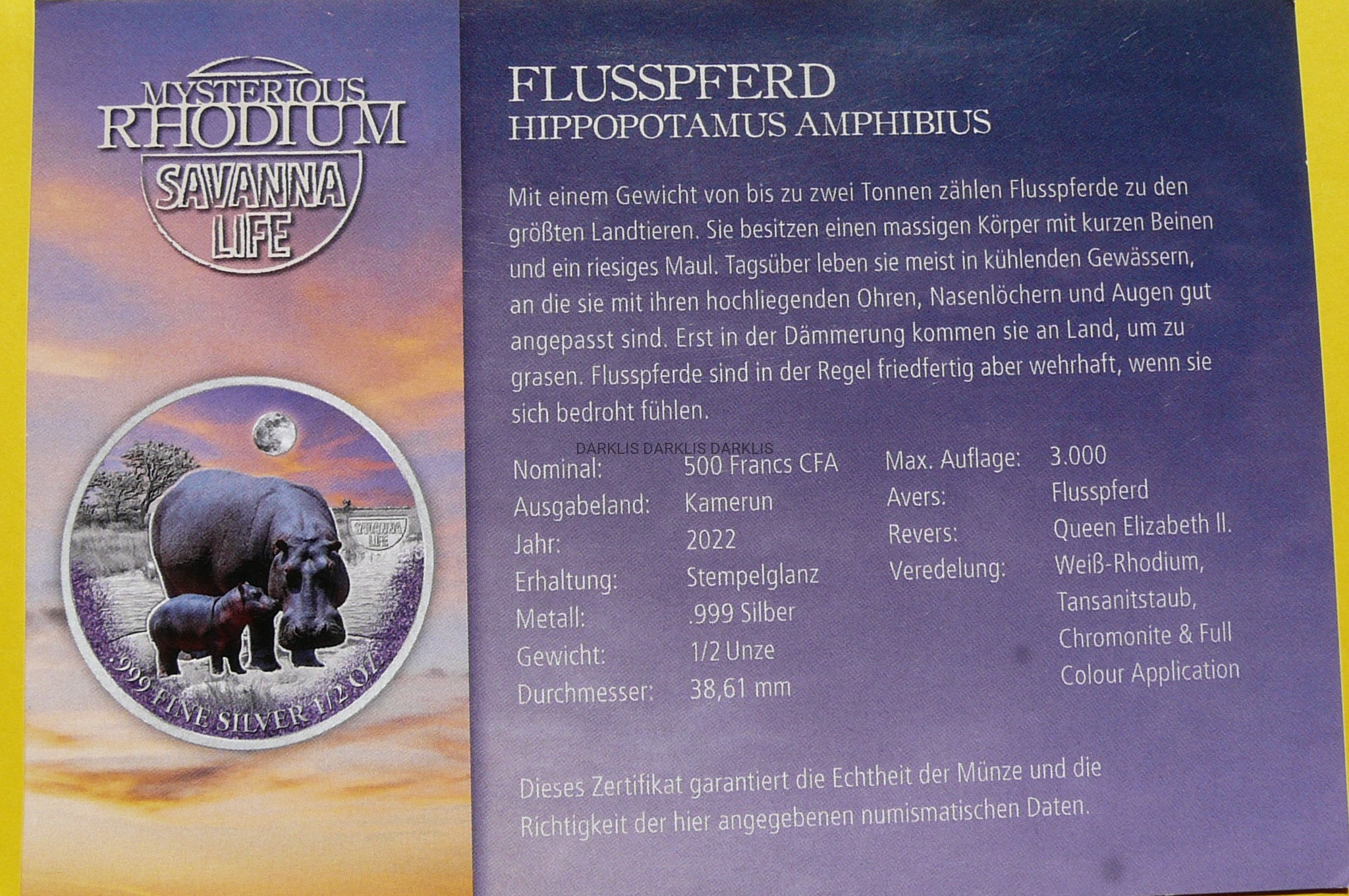NA AUKCJI WYSTAWIONA JEST PRZEPIĘKNA JEDNA ORYGINALNA i RZADKA SREBRNA MONETA KOLEKCJONERSKA - 500 FRANKÓW - KAMERUN 2022 - HIPOPOTAM - moneta z serii: TAJEMNICZE ŻYCIE RODZIMEJ SAWANNY - CZYSTE SREBRO PRÓBY 999 - KOLOR - RARYTAS - RZADKA - NAKŁAD TYLKO 3.000 SZTUK !! + CERTYFIKAT AUTENTYCZNOŚCI - NA INNYCH AUKCJACH WYSTAWIAM MONETY Z TEJ SERII - ZAPRASZAM DO OGLĄDANIA