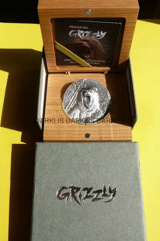NA AUKCJI WYSTAWIANA JEST PRZEPIĘKNA ORYGINALNA i BARDZO RZADKA SREBRNA MONETA KOLEKCJONERSKA - 5000 FRANKÓW - WYBRZEŻE KOŚCI SŁONIOWEJ 2020 - DRAPIEŻNIK NIEDŹWIEDŹ GRIZLLY / ZAGROŻONE GATUNKI OCHRONA ŻYCIA DZIKICH ZWIERZĄT - CZYSTE SREBRO 999 - 3 UNCJE - STEMPEL ANTIQUA - WYSOKI RELIEF - MENNICZA - RARYTAS - RZADKA - NAKŁAD TYLKO 750 SZTUK !!! + CERTYFIKAT AUTENTYCZNOŚCI + ORYGINALNE DREWNIANE PUDEŁKO + KARTON - NA INNYCH AUKCJACH WYSTAWIAM DUŻO SREBRNYCH MONET ZE ZWIERZĘTAMI - ZAPRASZAM DO OBEJRZENIA