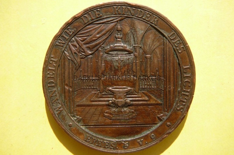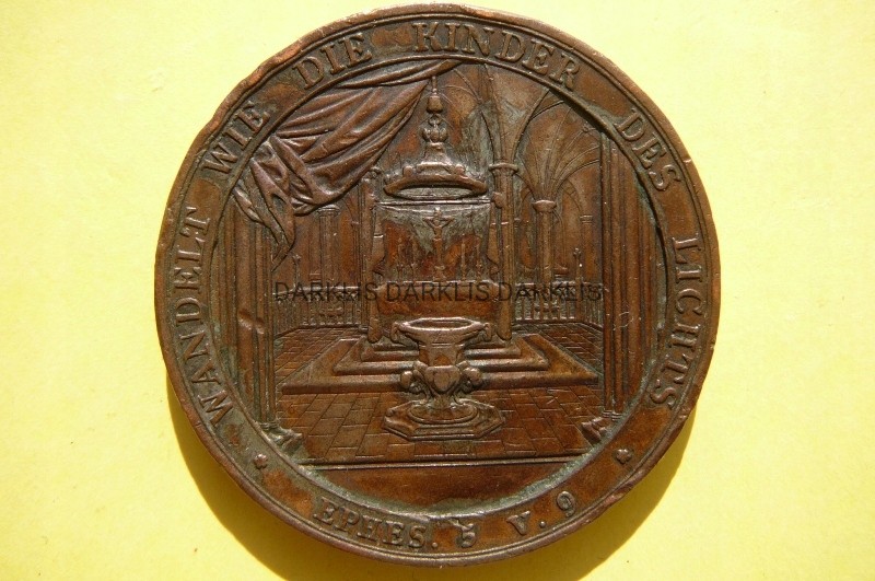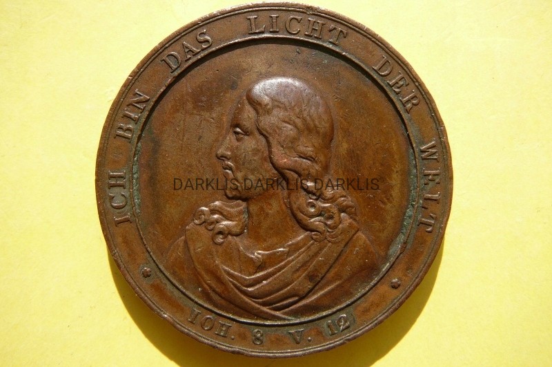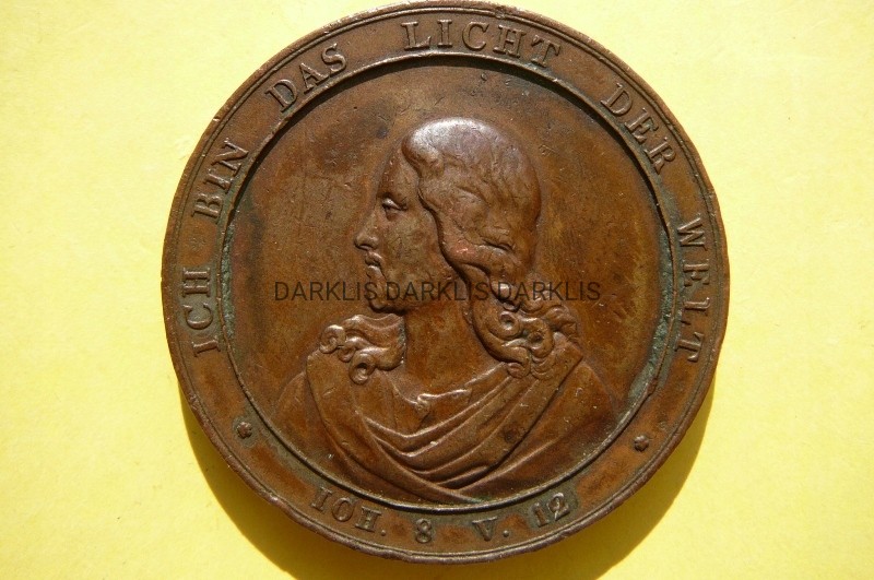 NA AUKCJI WYSTAWIANA JEST PRZEPIĘKNY MEDAL KOLEKCJONERSKI - MEDAL CHRZCIELNY 1832 - JEZUS - AUTOR: DANIEL FRIEDRICH LOOS i SYN - AWERS MEDALU CHRZCIELNEGO PRZEDSTAWIA: OŁTARZ W KOŚCIELE BAPTYSTERIUM PRZED NIM CHRZCIELNICA, W OTOKU NAPIS z PSALMU: „HODUJCIE JAK DZIECI ŚWIATŁA. EFE. 5 W. 9” - REWERS MEDALU CHRZCIELNEGO PRZEDSTAWIA: PÓŁPOSTAĆ PORTRET PATRZĄCEGO W LEWO, W OTOKU WPISY PSALM: „JESTEM ŚWIATŁEM ŚWIATA. JANA 8 X 12”